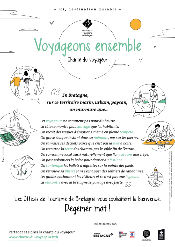 Nous sommes ravis de vous accueillir prochainement dans notre établissement et espérons que votre séjour en Bretagne sera aussi agréable qu’inoubliable. Dans le cadre de notre engagement envers le développement durable et le tourisme responsable, nous collaborons avec la Fédération des offices de tourisme de Bretagne pour promouvoir la Charte du Voyageur de Bretagne.